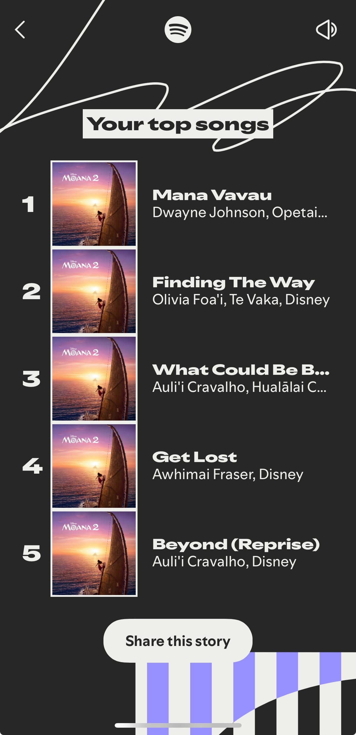 But my husband one-upped me by sending me his Spotify Wrapped, which is just a clean sweep by Moana 2.