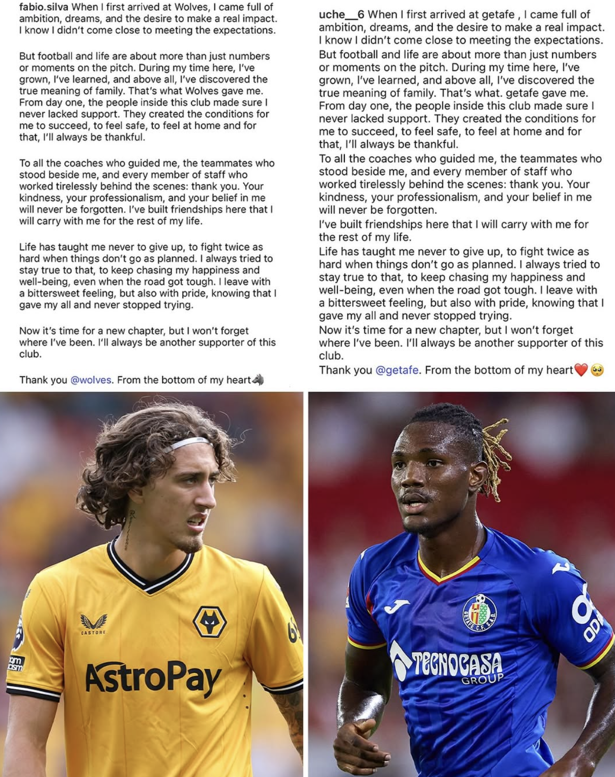 So good on him...until Christantaus Uche left Getafe and posted the exact same message on Instagram. Word for word. He just subbed in a different team name.