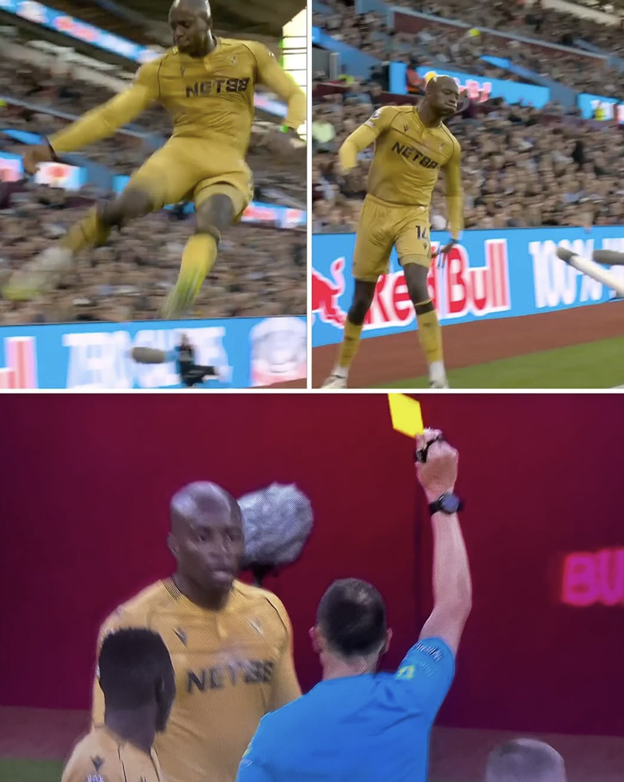 Mateta's trademark celebration is kicking the corner flag, but apparently you aren't allowed to "remove or damage" said flag when celebrating. So Stuart whipped out a yellow card in response.