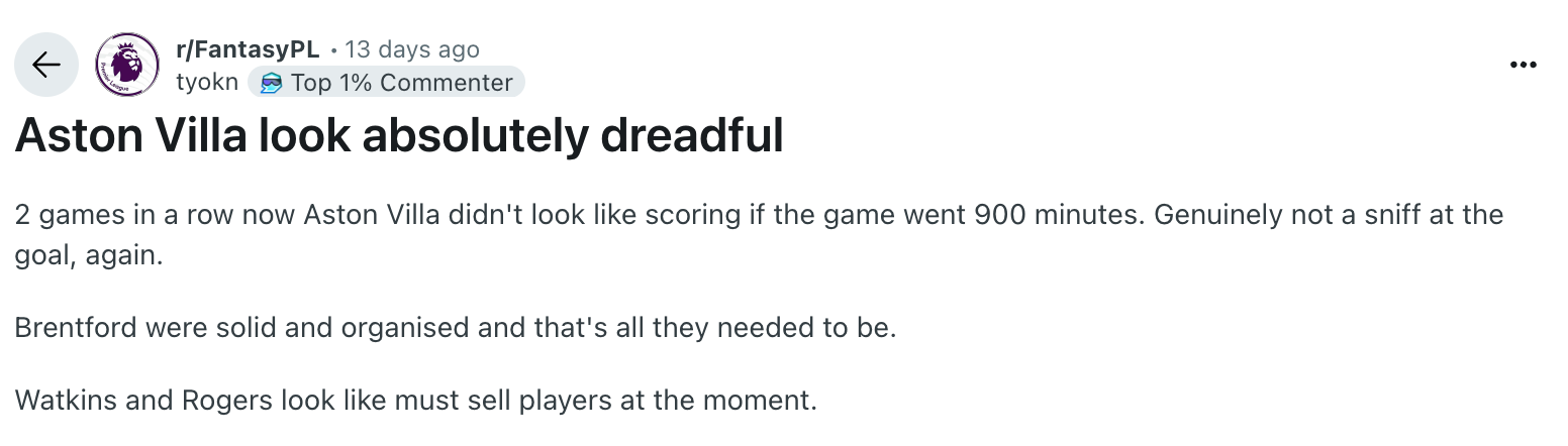Thus far, Villa’s attack has been about as threatening as a wet paper towel. I know that PSR completely hindered their chances of competing in the transfer market, but still. Let's see the Villans score a goal!