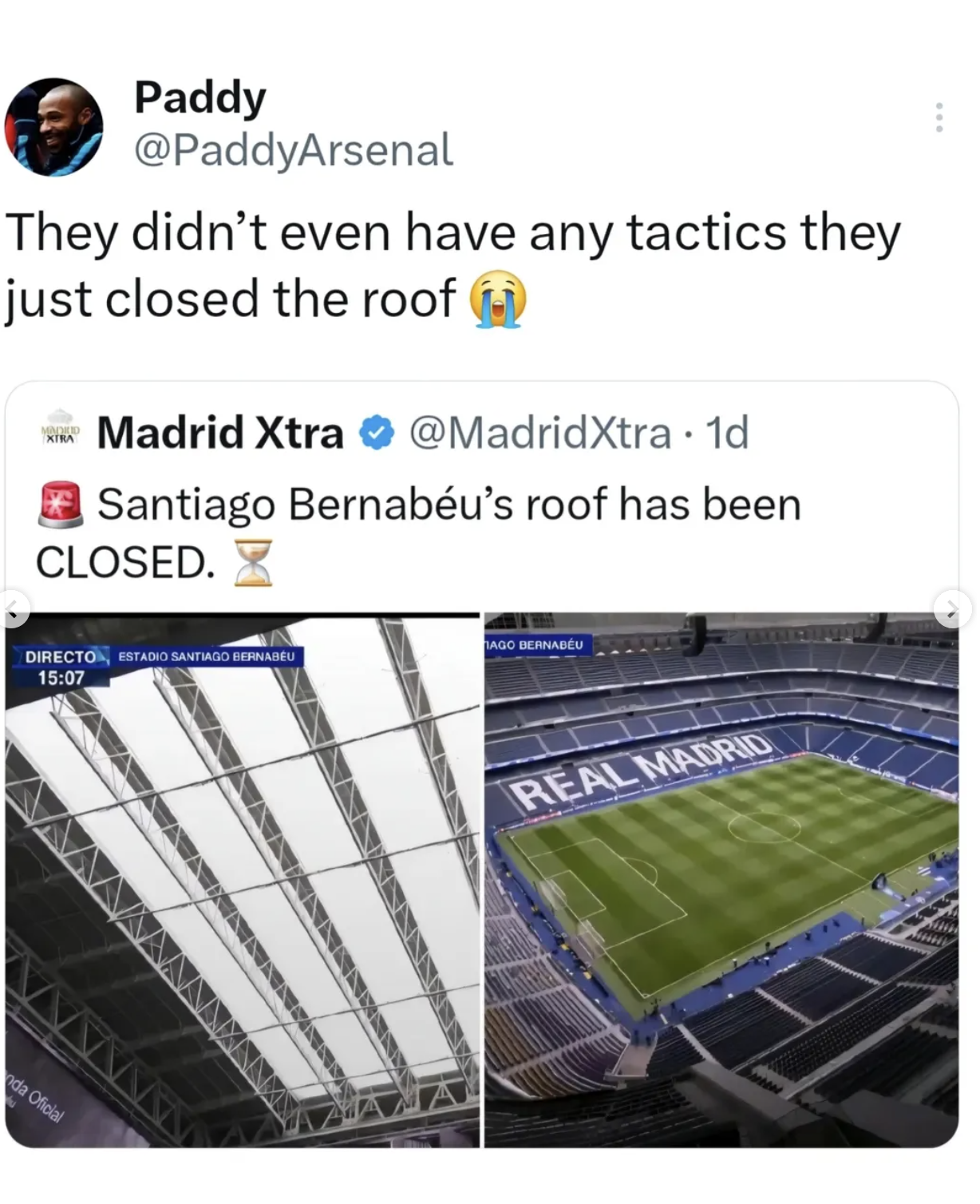 But all you really need to know is that Madrid posted about closing the roof on the Bernabeu to keep the noise levels up and create a tough atmosphere for Arsenal.