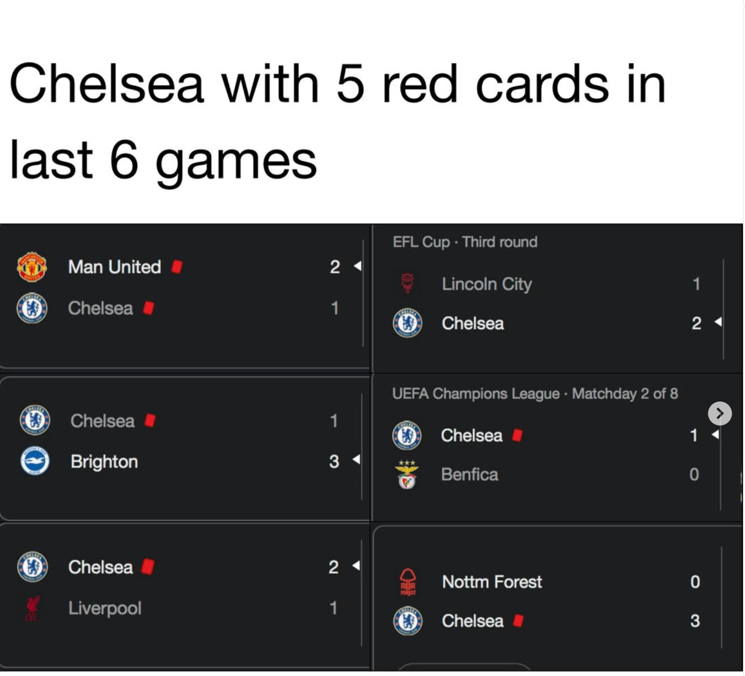 This came right after Enzo Maresca's own red card against Liverpool (also two yellow cards, the second for excessive celebration). Before that, Chelsea managed to collect red cards in three straight matches across all competitions.
