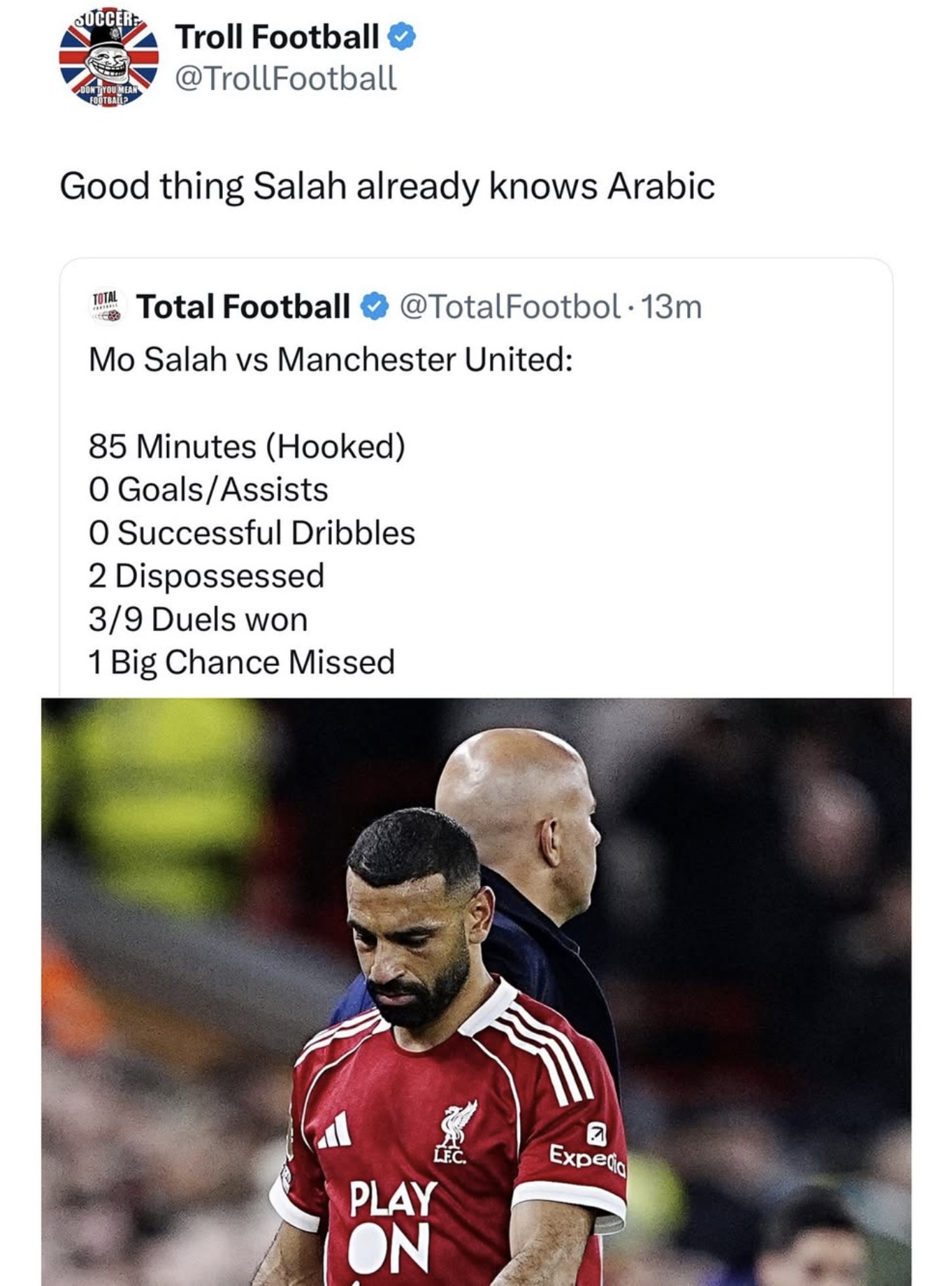 His goalless streak has gotten so bad that manager Arne Slot dropped him for the mid-week Champions League match against Eintracht Frankfurt. When pressed about it, Slot said it was a “difficult call,” which is manager-speak for “I have no idea what’s going on either.” When Mo did come on the pitch in the 74th minute, he opted not to pass to a wide-open Florian Wirtz, then promptly missed the shot he took. Oof.