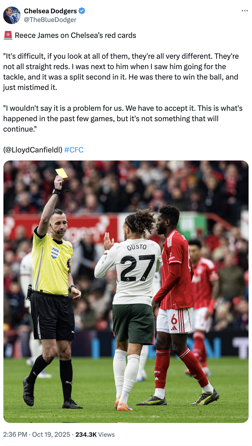 In the dying minutes of the Forest match, Chelsea's Malo Gusto saw red (two yellows, because of course). It didn't change the scoreline, just the vibes.