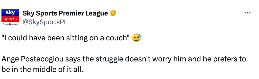 He spent a lot of time blustering about how he "always wins things in my second year," justifying his tenure at Tottenham (reminder: he was fired after they finished 17th last year), and saying confusing things like how he didn't have to be here [on the pitch], he could've just stayed on the couch.