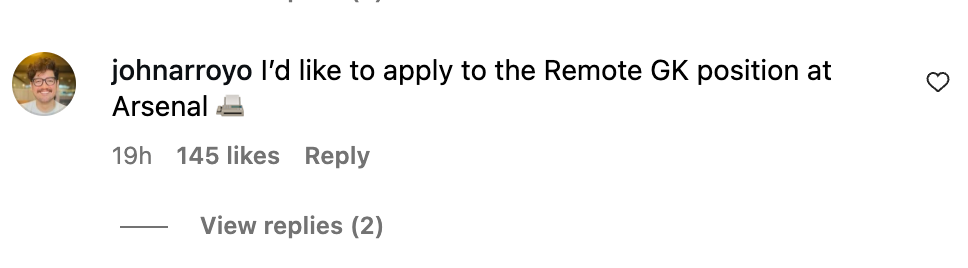 Our defense is so good that we barely face any shots on target. Our 'keeper David Raya is phenomenal, but he hasn't even had to do much, which is why Arsenal's IG keeps getting spammed with comments like this.