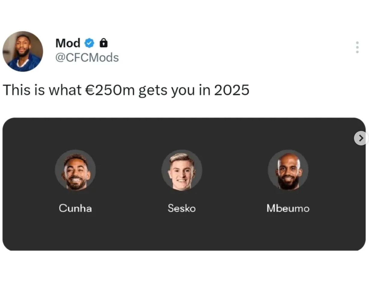 Maybe this is the dawn of a more measured Chelsea. Then again, the Blues are also reportedly looking to drop £50 million on Alejandro Garnacho, so maybe not. And, with defender Levi Colwill injured, Enzo Maresca is reportedly yelling about how he needs more signings, even though he literally has 12 other defensive bodies (that's the exact number, I double checked).