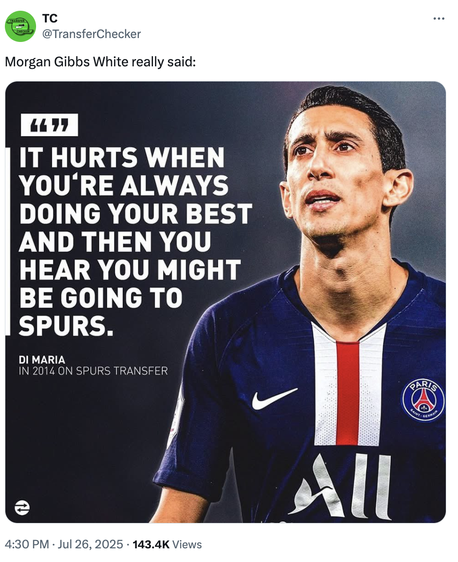 Please excuse me while I LOL about Morgan Gibbs-White staying at Nottingham Forest, because the whole thing by Tottenham was peak comedy.