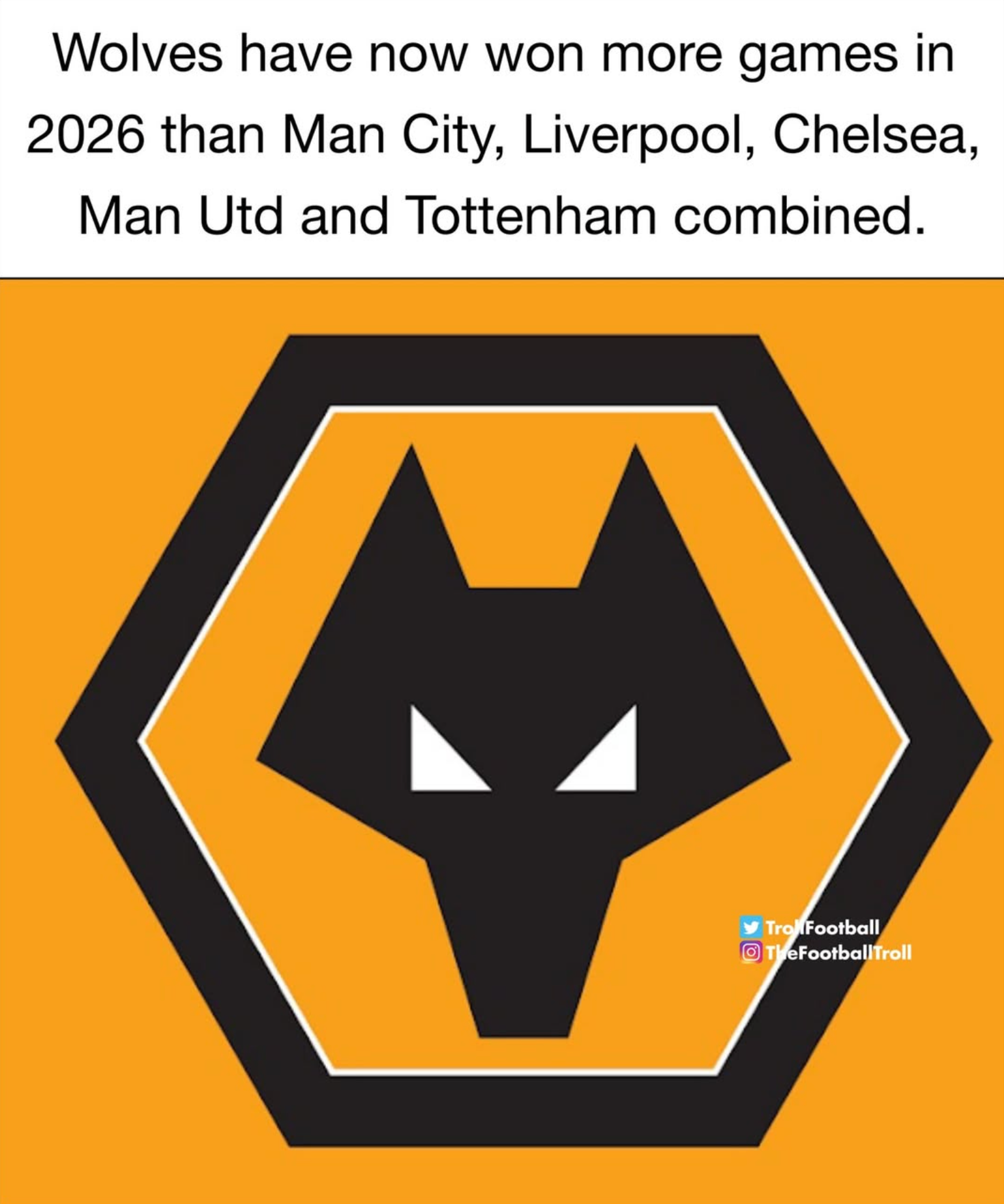 2026 has been the year of ties for every Big Six club besides Arsenal (HAHA). And Wolves are capitalizing on their run of modest opponents, taking one point from Manchester United and three from West Ham. They now have a whopping 6 points and are coming for Burnley. Watch your back, Clarets.