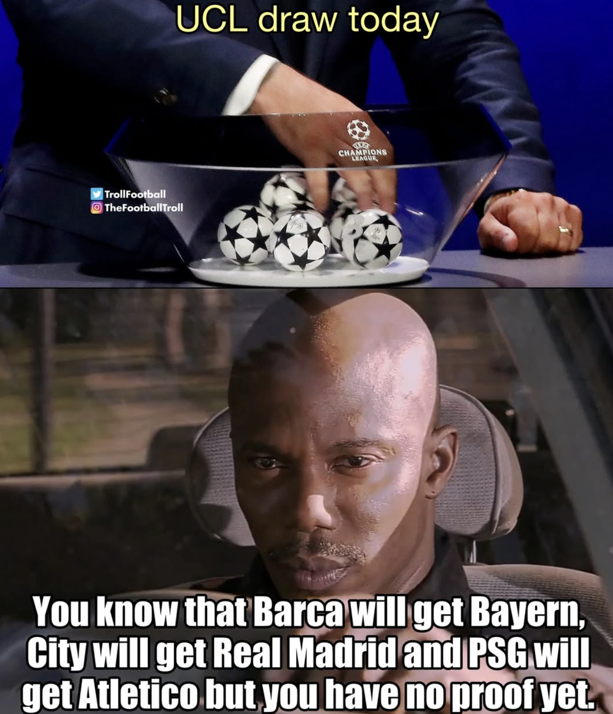 Lastly, in closing, I'll leave you with some news that dropped just yesterday: the Champion's League draws. Cue the most predictable twist in European football: Manchester City vs. Real Madrid. Again. Every single year.