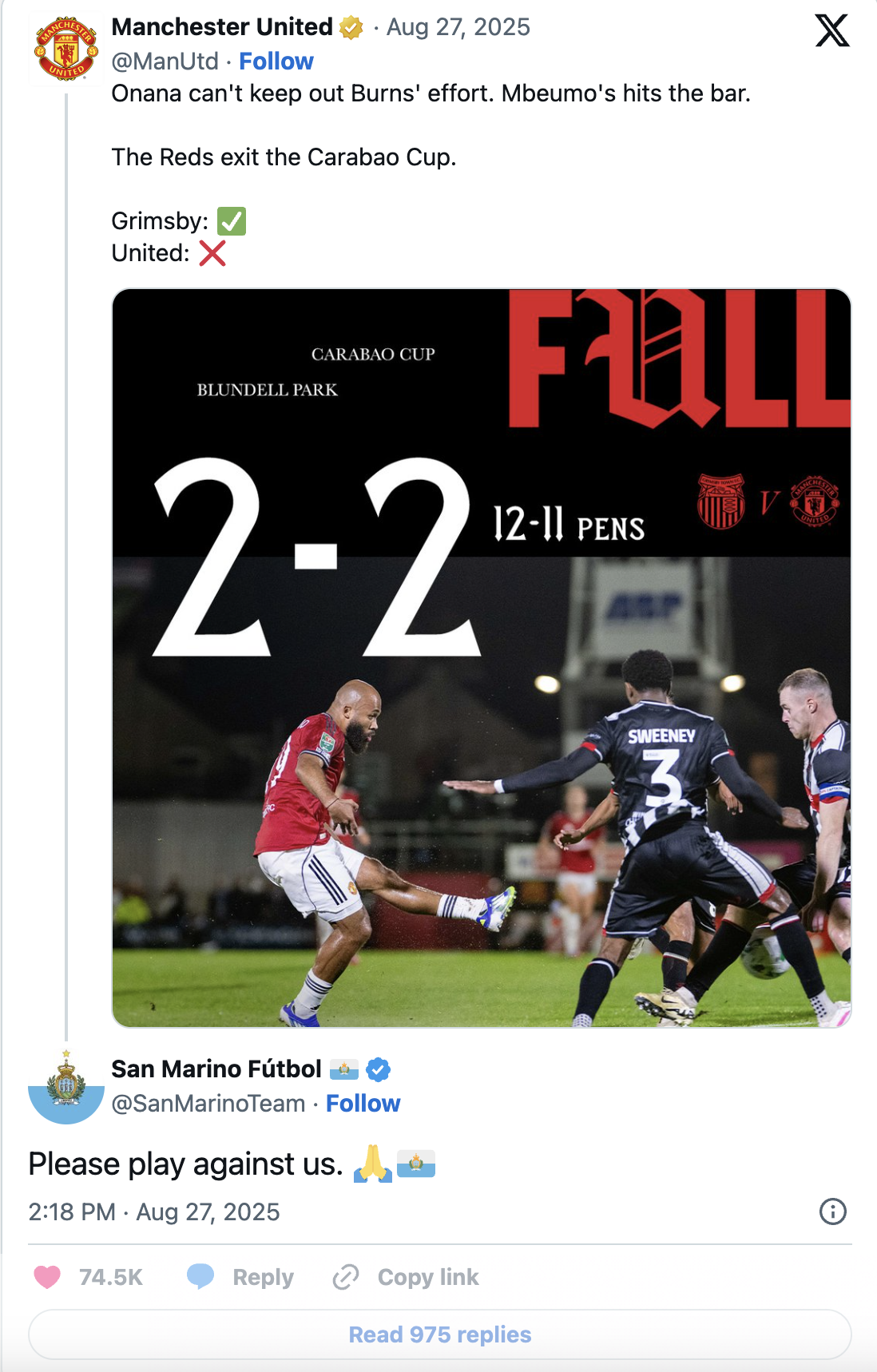 Fact of the matter is that Grimsby Town are a fourth league team. That's (counts) three divisions and 60+ places below United in the great footballing hierarchy of England. And it's not like Ruben Amorim played a third-string squad of 15 and 16-year-olds. Mbeumo was on the pitch! So were Cunha, Fernandes, and Sesko! Ironically, Mbeumo later missed his penalty, just adding insult to injury.